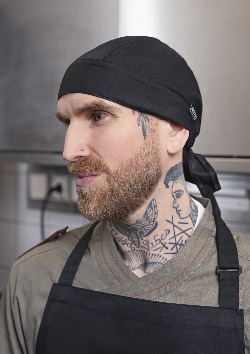Chusta na głowę; którą dopasowujemy poprzez wiązanie znajdujące się w tylnej części. Produkt wykonany z wysokiej jakości materiału. Wyjątkowo lekka tkanina odpowiada za komfort noszenia. Bandana dedykowana dla branży horeca.