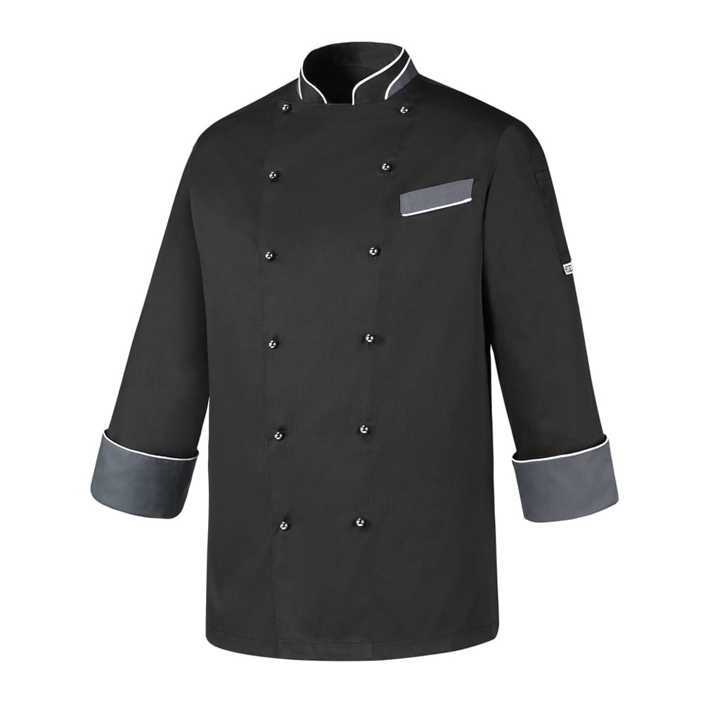 Bluza kucharska HEAT BLACK marki EGO CHEF z kolekcji HEAT to model, który zapinany jest na dwa rzędy guzików. Jednokolorowa bluza posiada wstawki w kontrastowych kolorach na stójce, kieszonce oraz mankietach. Zastosowane rozwiązania kolorystyczne powodują, iż bluza prezentuje się niezwykle efektownie. W tylnej części znajdują się delikatne wstawki AIR PLUS, czyli siateczka zapewniająca swobodny przepływ powietrza. Do bluzy polecamy fartuch z tej samej kolekcji - 6109016C.