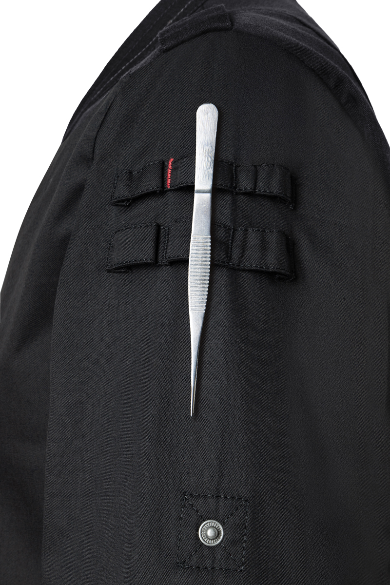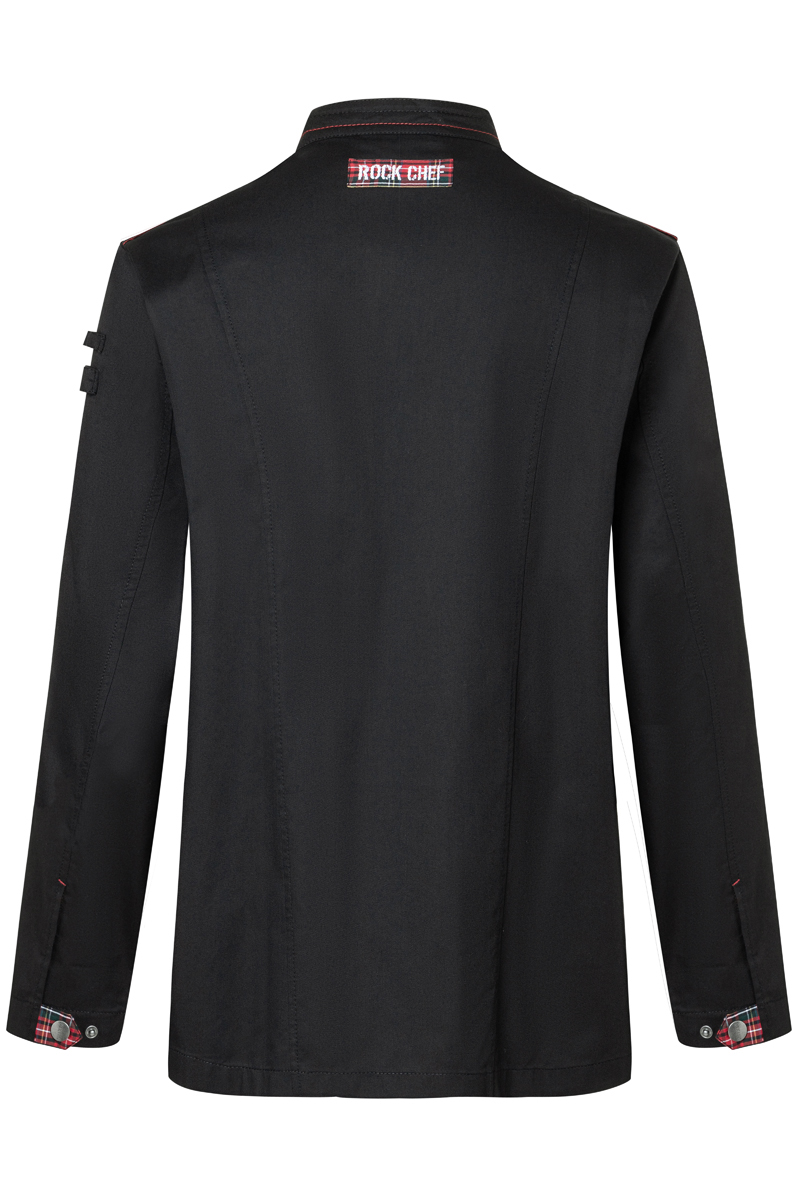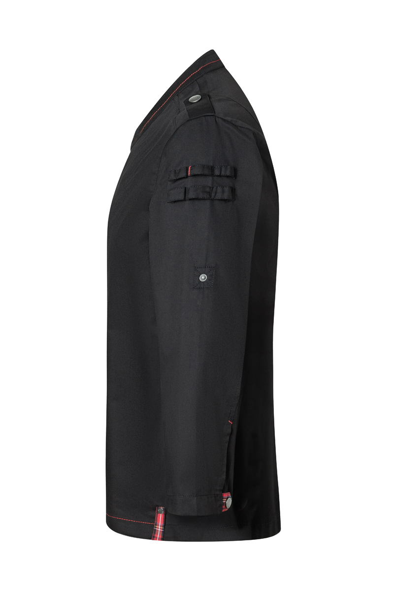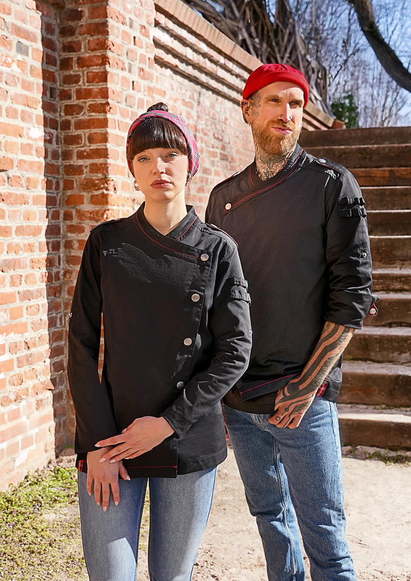 Model przyciąga uwagę charakterystycznymi detalami – czerwone kontrastowe przeszycia, elementy z tkaniny w kratę typu glencheck oraz ozdobne patki na ramionach nadają mu unikalny, „sceniczny” styl. Dodatkowo praktyczne uchwyty po lewej stronie umożliwiają wygodne przechowywanie drobnych akcesoriów, takich jak długopis czy pęseta kucharska.