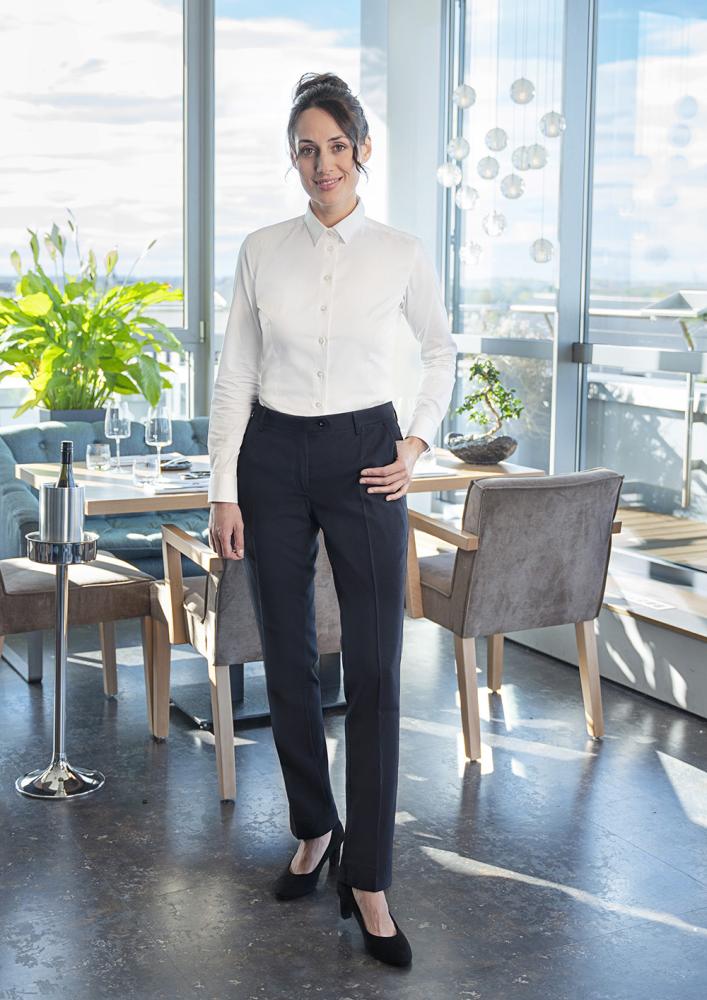 Eleganckie spodnie damskie kelnerskie w czarnym kolorze znanej i cenionej marki KARLOWSKY. Materiał zewnętrzny wykonany jest w 100% z trwałego poliestru 175 g/m². Na podszewkę składa się również poliester w 100%, 90g/m². Po bokach znajdują się dwie praktyczne kieszenie, natomiast z tyłu projektanci umieścili jeszcze jedną kieszonkę. Przy pasku znajdują się szlufki na pasek. Spodnie polecane są jako element ubioru damskiej części obsługi kelnerskiej. Do tego produktu idealnie pasują dostępne kamizelki i koszule kelnerskie. Klasyka połączona z nowoczesnością.