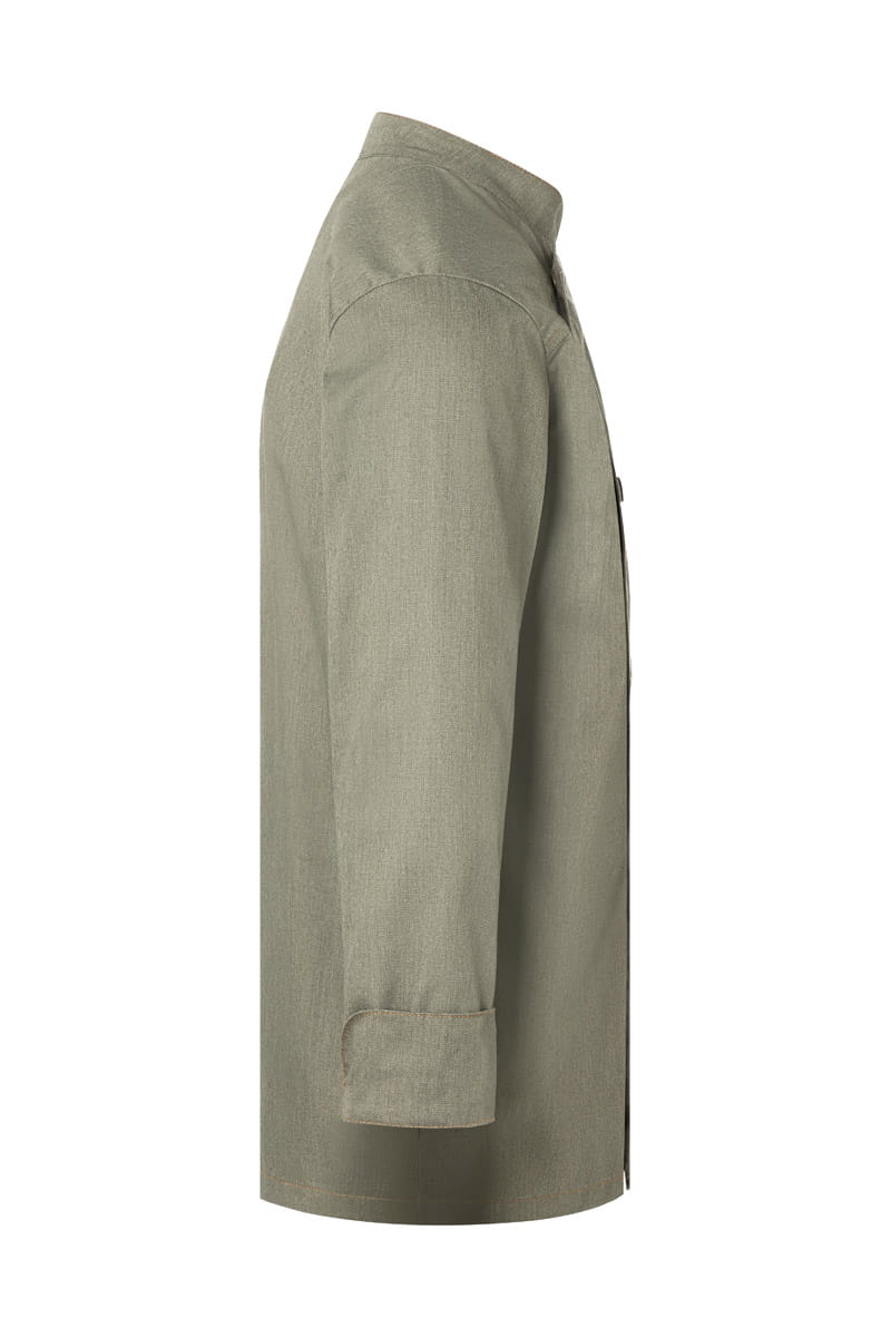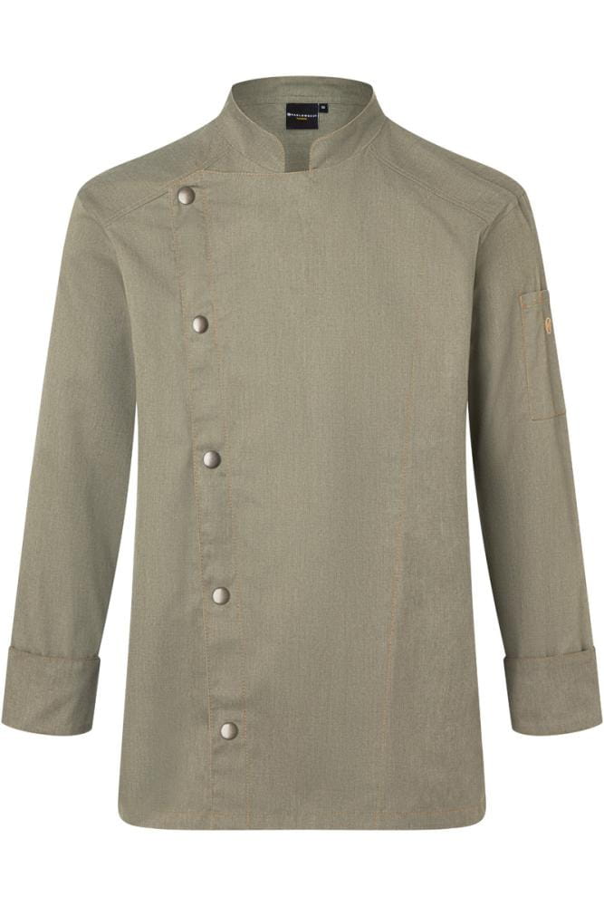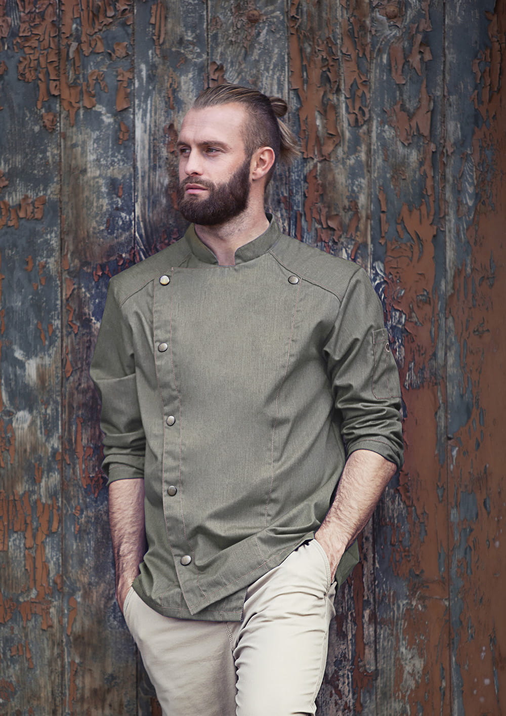 Męska bluza kucharska JEANS-STYLE firmy KARLOVSKY w kolorze zielonym (vintage moss green). Posiada długi rękaw, wywijane, eleganckie mankiety oraz praktyczną kieszonkę na lewym ramieniu. Zapięcie w formie zatrzasków znajduje się po prawej stronie bluzy i ukryte jest pod panelem materiału. Ozdobne wstawki dodają bluzie charakteru. Produkt wytworzony jest z poliestru 65% oraz bawełny 35% 195 g/m². Lekka tkanina ta wykonana została z wysokogatunkowych włókien, dlatego komfort pracy jest zapewniony nawet w wysokich temperaturach. Ponadto idealnie dopasowuje się do każdej sylwetki i jest niezwykle trwała. Ubrania gastronomiczne firmy KARLOWSKY łączą w sobie rewelacyjny wygląd z funkcjonalnością. Ponadto mogą być używane zarówno w restauracjach, jak i w cateringu. Odzież jest trwała i praktyczna.