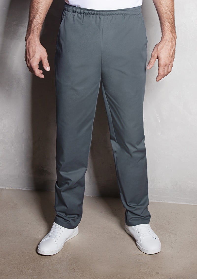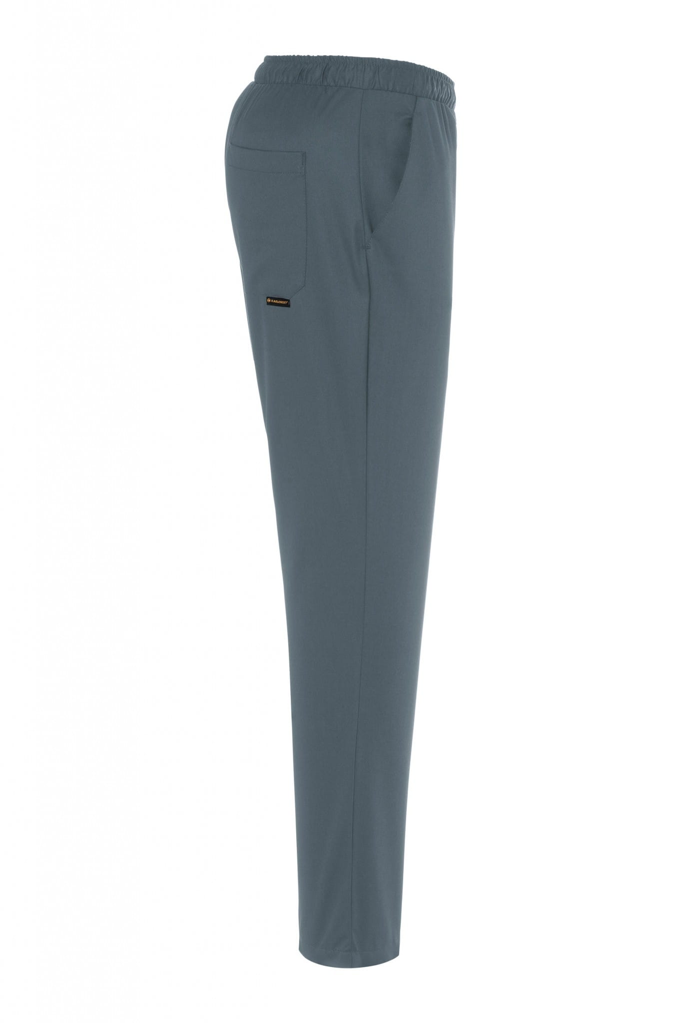 Stylowe; zwężane męskie spodnie typu rurki Slip-On Trouser KASPAR w kolorze antracytowym (szarym) znanej i cenionej marki KARLOVSKY. Wysokogatunkowy materiał wykonany jest w 65% z poliestru i 35% 215 g/m². Po bokach i z tyłu znajdują się dwie praktyczne kieszenie. Produkt dopasuje się do każdej sylwetki; gdyż w pasie umieszczono elastyczną gumkę. Spodnie mają uniwersalne zastosowanie - mogą być używane przez wszystkich pracowników branży HoReCa. Są wysoko odporne na plamy; a czyszczenie ich czyszczenie jest bardzo łatwe. Klasyka połączona z nowoczesnością.