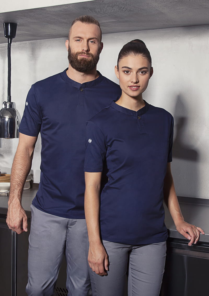 T-shirt kucharski z krótkim rękawem Short-Sleeve Work Shirt Performance to wyjątkowa propozycja producenta KARLOWSKY. Produkt ma nowoczesny, sportowy wygląd dzięki stylowej stójce ozdobionej praktycznym guzikiem. Na wysokości klatki piersiowej projektanci umieścili funkcjonalną kieszeń, która również zapinana jest na oryginalny guzik. Produkt wytworzony jest z poliestru 40% 150 g/m² oraz bawełny 60%, natomiast tył bluzy wykonany jest z jersey'u (drobna siateczka - poliester 100% 150 g/m²), więc pewna jest maksymalna wentylacja. Tkanina ta wykonana została z wysokogatunkowych włókien, dlatego komfort pracy jest zapewniony nawet w wysokich temperaturach. Bluza została zaprojektowana w taki sposób, że idealnie dopasowuje się do każdej sylwetki i jest niezwykle trwała. Ubrania gastronomiczne firmy KARLOWSKY łączą w sobie rewelacyjny wygląd z funkcjonalnością. Ponadto mogą być używane zarówno w restauracjach, jak i w cateringu. Odzież jest trwała i praktyczna.