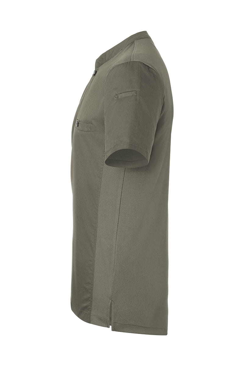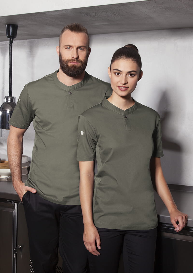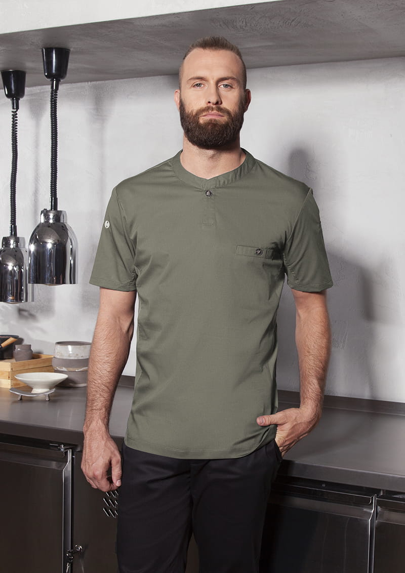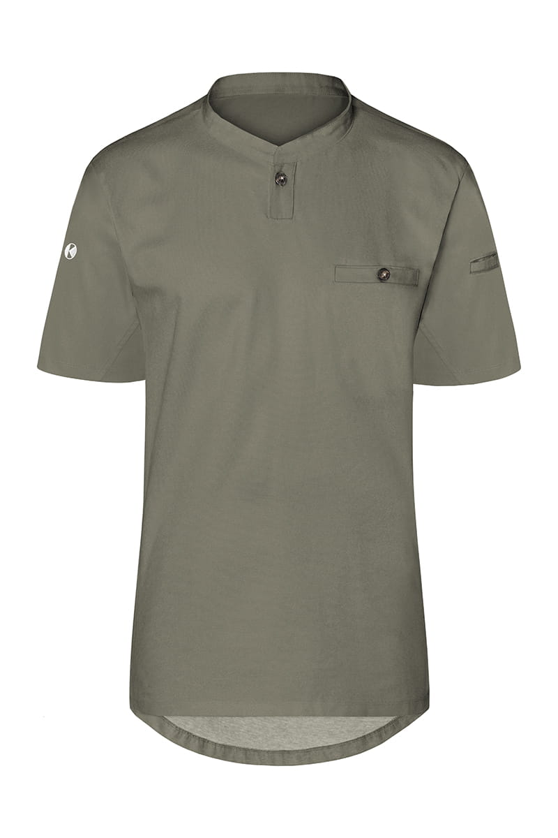 T-shirt kucharski z krótkim rękawem Short-Sleeve Work Shirt Performance to wyjątkowa propozycja producenta KARLOWSKY. Produkt ma nowoczesny, sportowy wygląd dzięki stylowej stójce ozdobionej praktycznym guzikiem. Na wysokości klatki piersiowej projektanci umieścili funkcjonalną kieszeń, która również zapinana jest na oryginalny guzik. Produkt wytworzony jest z poliestru 40% 150 g/m² oraz bawełny 60%, natomiast tył bluzy wykonany jest z jersey'u (drobna siateczka - poliester 100% 150 g/m²), więc pewna jest maksymalna wentylacja. Tkanina ta wykonana została z wysokogatunkowych włókien, dlatego komfort pracy jest zapewniony nawet w wysokich temperaturach. Bluza została zaprojektowana w taki sposób, że idealnie dopasowuje się do każdej sylwetki i jest niezwykle trwała. Ubrania gastronomiczne firmy KARLOWSKY łączą w sobie rewelacyjny wygląd z funkcjonalnością. Ponadto mogą być używane zarówno w restauracjach, jak i w cateringu. Odzież jest trwała i praktyczna.