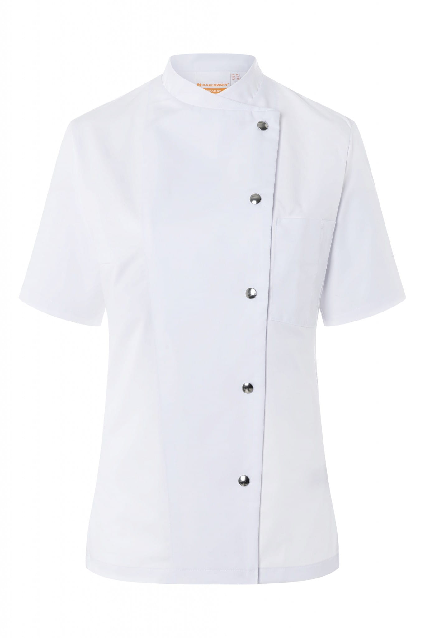 Damska bluza kucharska GRETA firmy KARLOVSKY w kolorze białym. Posiada krótki rękaw oraz praktyczną kieszonkę na wysokości klatki piersiowej. Zapięcie w formie pięciu praktycznych, nowoczesnych zatrzasków, które znajduje się po lewej stronie bluzy. Produkt wykonany jest z poliestru 65% oraz bawełny 35% 215 g/m². Tkanina ta wykonana została z wysokogatunkowych włókien, dlatego komfort pracy jest zapewniony nawet w wysokich temperaturach. Ponadto idealnie dopasowuje się do kobiecej sylwetki i jest niezwykle trwała. Ubrania gastronomiczne firmy KARLOWSKY łączą w sobie rewelacyjny wygląd z funkcjonalnością. Ponadto mogą być używane zarówno w restauracjach, jak i w cateringu. Odzież jest trwała i praktyczna.