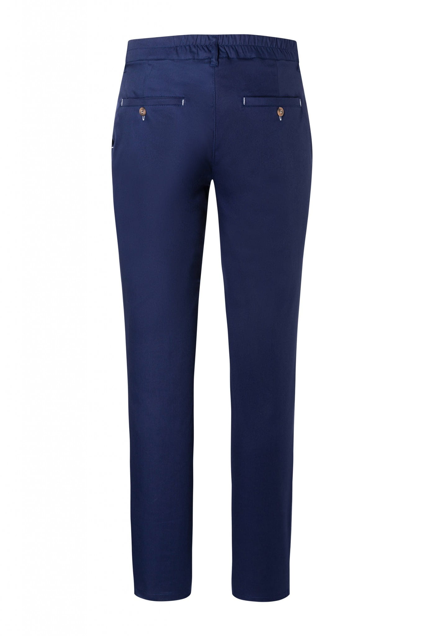 Stylowe, zwężane męskie spodnie typu rurki Chino MODERN-STRETCH w kolorze granatowym znanej i cenionej marki KARLOVSKY. Wysokogatunkowy materiał wykonany jest w 59% z bawełny, 39% poliestru oraz 2% elastanu 206 g/m². Po bokach i z tyłu znajdują się dwie praktyczne kieszenie. Kieszonki z tyłu ozdobione są kontrastowym guzikiem. Produkt dopasuje się do każdej sylwetki, gdyż w pasie umieszczono elastyczną gumkę i wygodne sznurowanie. Spodnie mają uniwersalne zastosowanie - mogą być używane przez wszystkich pracowników branży HoReCa. Klasyka połączona z nowoczesnością.