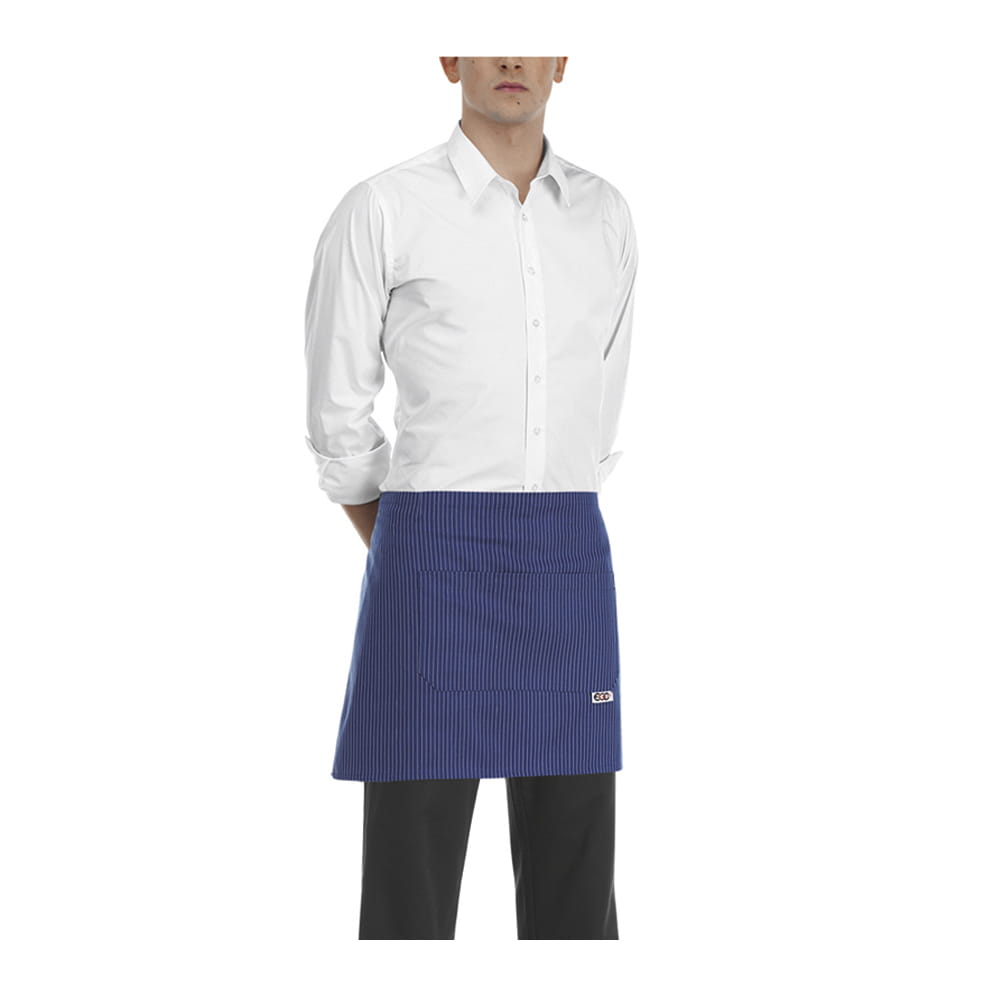Prezentowany fartuch wykonany jest z materiału w kolorze granatu, który posiada wzór w drobne pionowe pasy w kolorze białym. Zapaska jest wykonana z materiału, który składa się w 65% z poliestru, a w 35% z bawełny. Tak duża ilość poliestru w tkaninie wpływa dodatnio na jej wytrzymałość, czyniąc zapaskę produktem odpornym na wielokrotne pranie, łatwym w czyszczeniu i niewchłaniającym zabrudzeń. Zapaska ma na przodzie dużą kieszeń podzieloną dla wygody na dwie pojemne komory, które z łatwością pomieszczą wszystkie niezbędne drobiazgi. Sprawdź, jaka odzież gastronomiczna oraz odzież kelnerska znajduje się w asortymencie naszego sklepu ubraniadlakucharzy.pl.